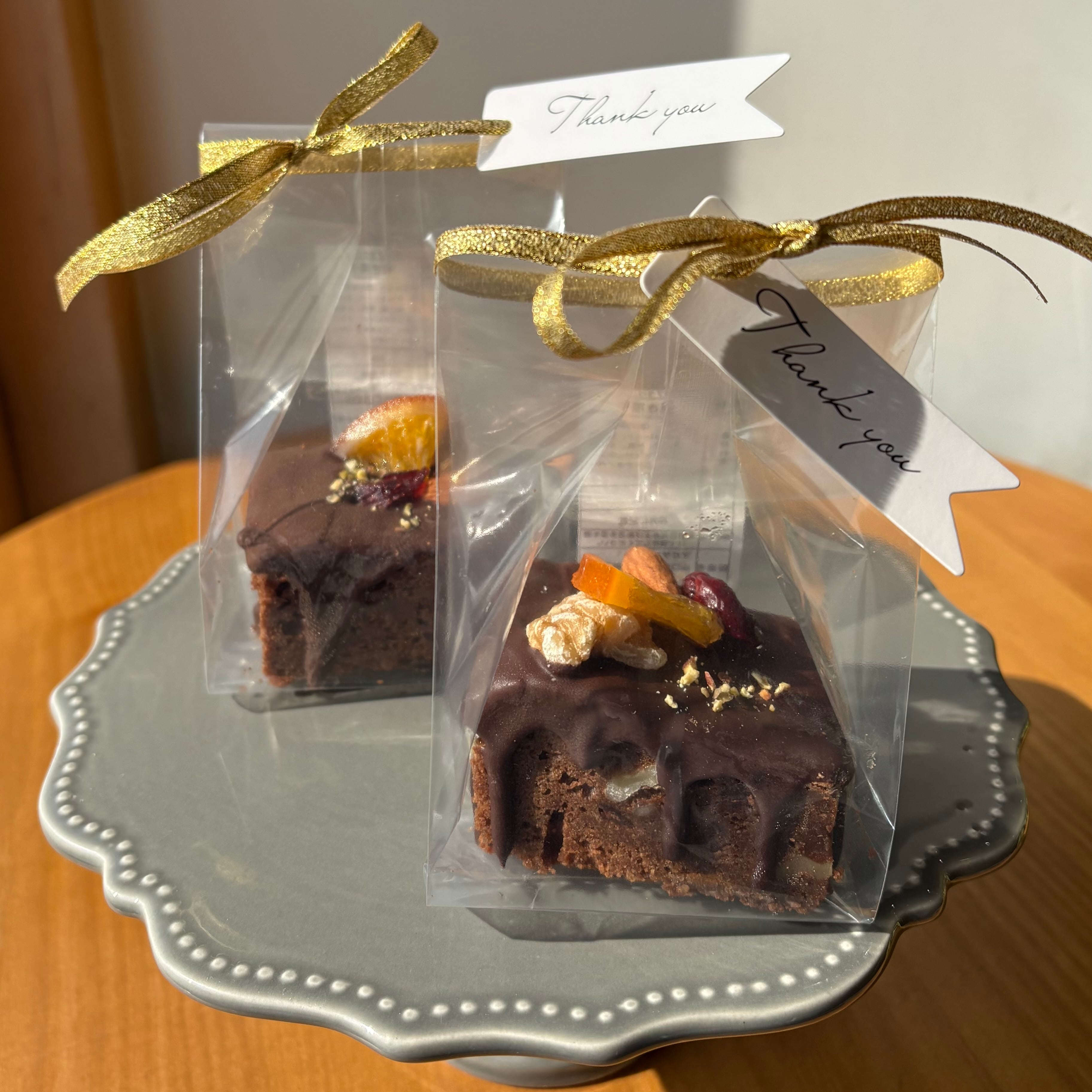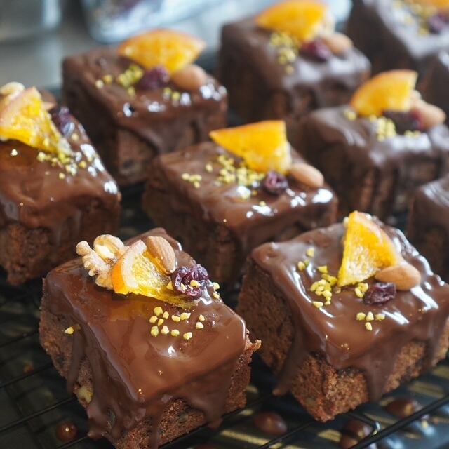 当店人気のブラウニーにチョコがけし、ナッツとドライフルーツ・オレンジを散りばめました